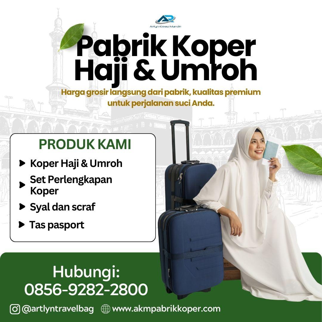 - Koper Haji & Umroh Custom Logo: tersedia berbagai ukuran, bisa dicetak logo travel agency, material kuat dan ringan, harga langsung dari pabrik.