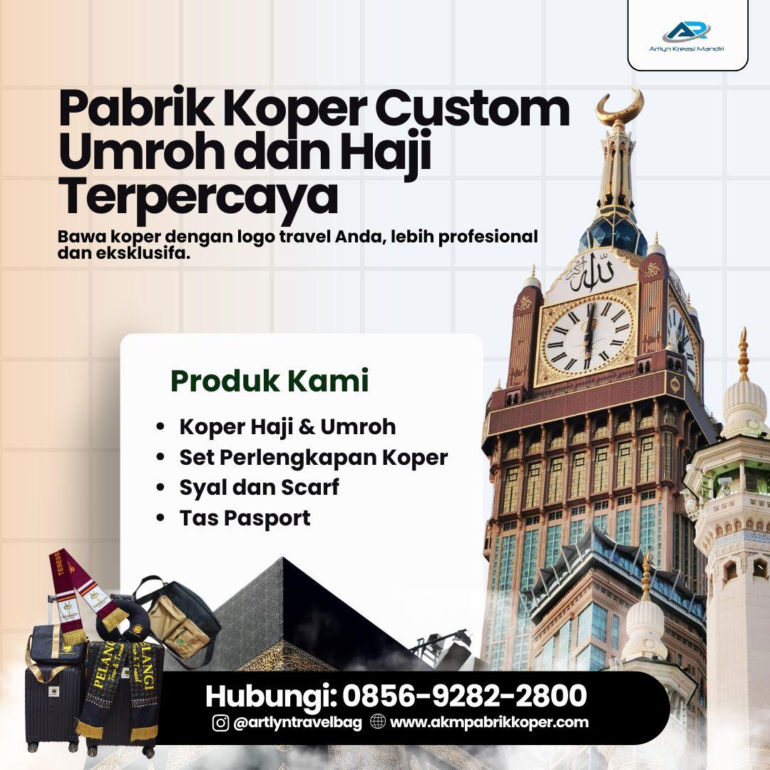 "KLIK: https://wa.me/6285692822800, PT. Artlyn Kreasi Mandiri (AKM) adalah pabrik perlengkapan umroh dan haji terpercaya di Indonesia. Kami memproduksi berbagai perlengkapan jamaah seperti koper custom logo, tas paspor, bantal leher, mukena, dan syal dalam skala besar. Semua produk dibuat langsung di pabrik dengan harga grosir dan kualitas premium, khusus untuk travel agency, biro umroh, dan tour & travel di seluruh Indonesia hingga Malaysia.