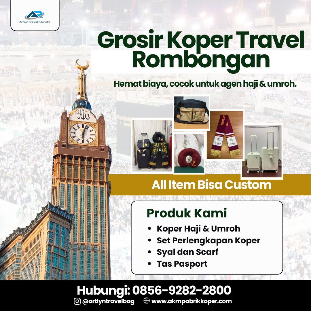 Dengan koper custom logo dari PT. Artlyn Kreasi Mandiri (AKM), travel agency Anda akan tampil lebih profesional, jamaah lebih percaya, dan branding semakin kuat. Jangan biarkan travel agency Anda terlihat biasa saja, saat kompetitor sudah menggunakan perlengkapan berlogo.