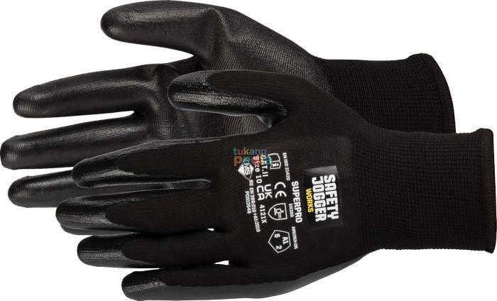 Sarung tangan pengaman poliester hitam dengan lapisan nitril hitam. Sarung tangan poliester SUPERPRO yang mulus dirancang untuk pekerjaan ringan dan halus yang membutuhkan ketangkasan dan kepekaan. Lapisan hitam memberikan cengkeraman yang sangat baik di lingkungan yang sedikit berminyak. Lapisan nitril pada telapak tangan memastikan cengkeraman yang baik di lingkungan yang kering dan sedikit berminyak.
